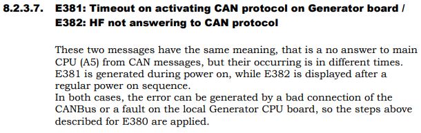 E381: Timeout on activating CAN protocol on Generator board / E382: HF not answering to CAN protocol