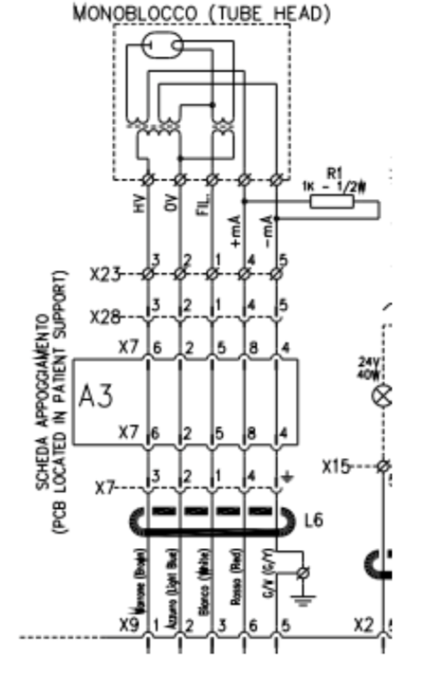 - connected the X9 connector and check the tubehead voltage when take the exposure (brown and blue wires) pins 1-2 of X9 : 235v AC 85kV – 220v AC 80kV – 210v AC 75kV – 195v AC 70kV – 180v AC 65kV – 170v AC 60kV